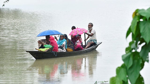 മോറിഗാവ് ജില്ലയിലെ മയോങില് വെള്ളപ്പൊക്ക ബാധിത പ്രദേശത്ത് നിന്ന് വള്ളത്തില് രക്ഷപ്പെടുന്നവര്.