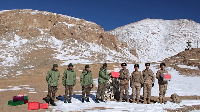 കാരക്കോണം ചുരത്തില് ഇന്ത്യ- ചൈന സൈനികര് പരസ്പരം മധുരം കൈമാറുന്നു എഎൻഐ