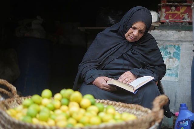 ഈജിപ്തിലെ കെയ്റോയിലെ മാർക്കറ്റിൽ നാരങ്ങ വില്പനക്കിടെ ഖുർആൻ വായിക്കുന്ന സ്ത്രീ. എപി