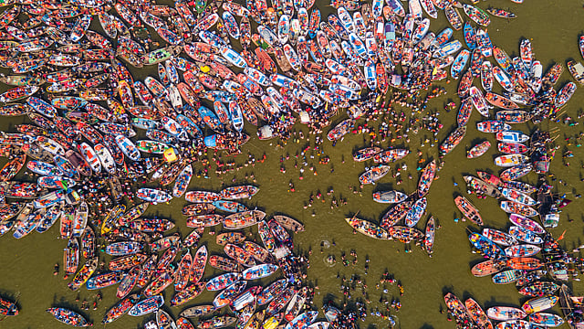 കുംഭമേളയ്ക്ക് ഭക്തർ എത്തിയ ബോട്ടുകൾ, ആകാശദൃശ്യം പിടിഐ