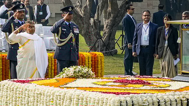 ഗാന്ധിസമാധിയായ ഡല്ഹിയിലെ രാജ്ഘട്ടില് ആദരാഞ്ജലിയര്പ്പിക്കുന്ന രാഷ്ട്രപതി ദ്രൗപദി മുര്മു