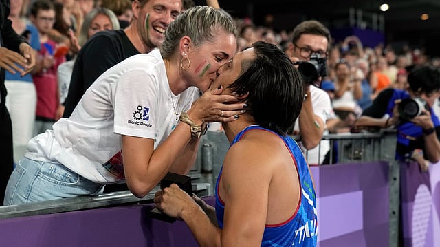 പുരുഷന്‍മാരുടെ 100 മീറ്റര്‍ പൂര്‍ത്തിയാക്കിയ ശേഷം കാമുകിയോട് വിവാഹാഭ്യര്‍ഥന നടത്തുന്ന അലസ്സാന്‍ഡ്രോ ഒസോല എപി