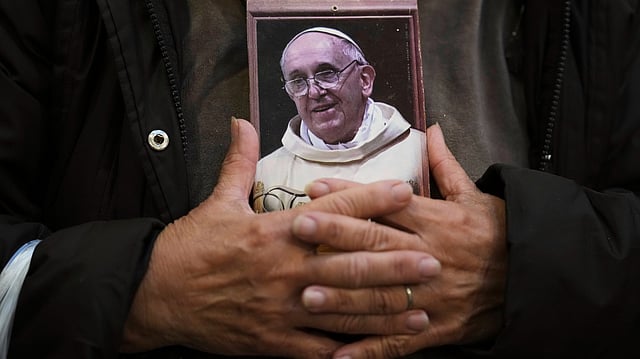 മാർപാപ്പയുടെ ഫോട്ടോ നെഞ്ചോട് ചേർത്ത് പ്രാർഥിക്കുന്ന വിശ്വാസി. എപി