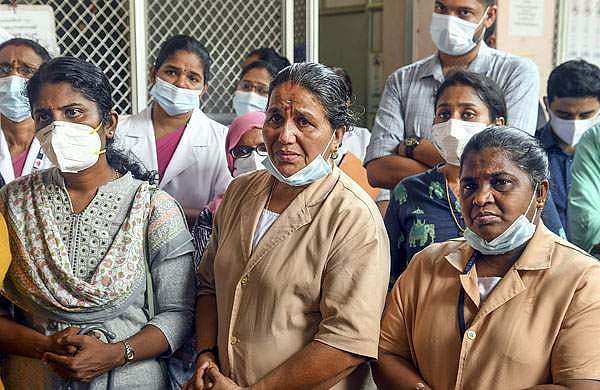 വൈദ്യപരിശോധനക്കെത്തിച്ച സ്കൂൾ അധ്യാപകന്റെ കുത്തേറ്റ് ഡോക്ടർ വന്ദന കൊല്ലപ്പെട്ടതിൽ തിരുവനന്തപുരം ജനറൽ ആശുപത്രിയിലെ ഡോക്ടർമാരും മെഡിക്കൽ സ്റ്റാഫും പ്രതിഷേധിച്ചപ്പോൾ/ചിത്രം: പിടിഐ