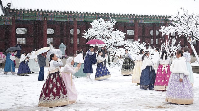 സോളിലെ ഗ്യോങ്‌ബോക് പാലസില്‍ മഞ്ഞില്‍ കളിക്കുന്ന വിനോദസഞ്ചാരികള്‍