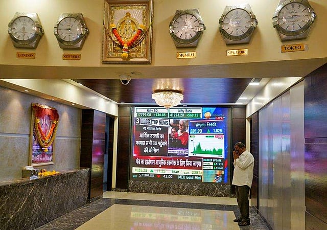 ബോംബെ സ്റ്റോക്ക് എക്സ്ചേഞ്ച് കെട്ടിടത്തിൽ 2023-24 കേന്ദ്ര ബജറ്റ് അവതരണത്തിന്റെ തത്സമയ സംപ്രേക്ഷണത്തിനിടെ ഒരാൾ പ്രാർത്ഥിക്കുന്നു/ ചിത്രം: എഎൻഐ