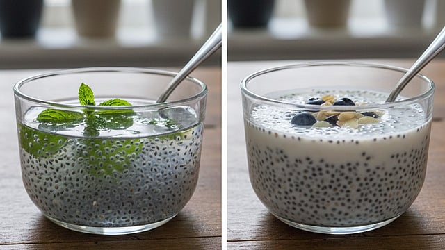 പ്രഭാതഭക്ഷണത്തിനോ അല്ലെങ്കിൽ വൈകുന്നേരത്തെ ലഘുഭക്ഷണത്തിനോ പകരമായി ഉപയോഗിക്കാൻ പറ്റിയതാണ് പാലിൽ ചേർത്ത ചിയ സീഡ്സ് അഥവാ ചിയ പുഡ്ഡിങ്. പാലിലെ കാത്സ്യം, പ്രോട്ടീൻ, വിറ്റാമിൻ ബി 12 എന്നിവ ശരീരത്തിന് ദിവസം മുഴുവൻ വേണ്ട ഊർജ്ജം നൽകുകയും വയറു നിറഞ്ഞ തോന്നൽ ഉണ്ടാക്കുകയും ചെയ്യുന്നു. എന്നാല് കൊഴുപ്പ് കൂടിയ പാൽ ഉപയോഗിക്കുന്നത് കാലറി വർധിക്കാൻ കാരണമാകുമെന്നതിനാൽ അളവ് നിയന്ത്രിക്കാൻ പ്രത്യേകം ശ്രദ്ധിക്കണം.