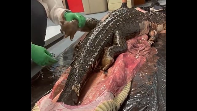 കൂറ്റന് മുതലയെ ഒന്നടങ്കം വിഴുങ്ങിയിരിക്കുകയാണ് ബര്മീസ് പൈത്തണ്. അമേരിക്കയിലെ ഫ്ളോറിഡയിലാണ് സംഭവം. എവര്ഗ്ലേഡ്സിലെ ദേശീയ പാര്ക്കില് നിന്ന് തൊഴിലാളികള് പിടികൂടിയ 18 അടി നീളമുള്ള കൂറ്റന് പെരുമ്പാമ്പിന്റെ വയറ്റില് നിന്നാണ് മുതലയെ കണ്ടെടുത്തത്. പാമ്പിനെ തല്ലിക്കൊന്ന ശേഷം പരിശോധിച്ചപ്പോഴാണ് അഞ്ചടി നീളമുള്ള മുതല വയറ്റില് ഉണ്ടെന്ന് തിരിച്ചറിഞ്ഞത്.