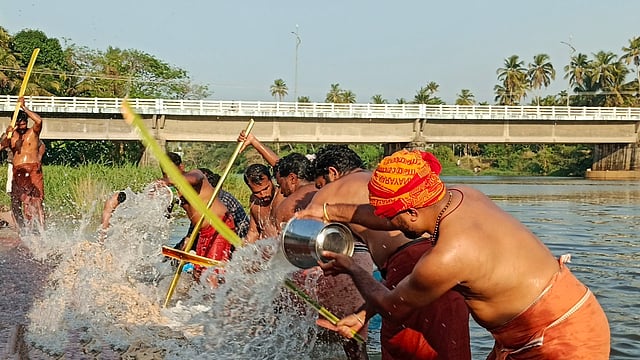 ആറാട്ടുപുഴ പൂരത്തിന് പന്തമൊരുക്കുന്നതിനുള്ള തുണി പുഴക്കടവില് പുഴുങ്ങിയെടുക്കുന്നു