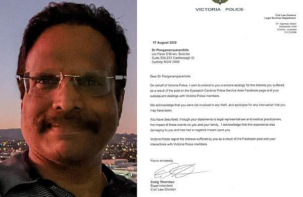 മോഷണക്കുറ്റം ആരോപിച്ച് ഫോട്ടോ പ്രചരിപ്പിച്ച ഓസ്ട്രേലിയന് പൊലീസിനെ തളരാത്ത നിയമ പോരാട്ടത്തിലൂടെ മാപ്പു പറയിച്ച് മലയാളി ഡോക്ടര്. 2020ല് നടന്ന സംഭവത്തില് രണ്ടു വര്ഷം നീണ്ട നിയമ പോരാട്ടത്തിനൊടുവില് ഇക്കഴിഞ്ഞ ഓഗസ്റ്റ് 17നാണ് വിക്ടോറിയ പൊലീസ് ഡോക്ടറോട് പരസ്യമായി ഖേദപ്രകടനം നടത്തിയത്.