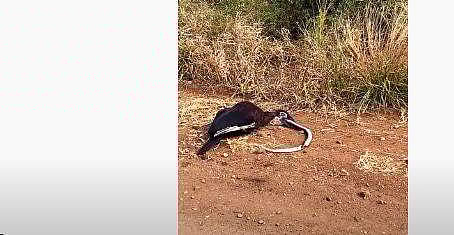 സൗത്ത് ആഫ്രിക്കയില് കാണപ്പെടുന്ന സതേണ് ഗ്രൗണ്ട് വേഴാമ്പലിന്റേതാണ് ദൃശ്യം. മാംസഭുക്കുകളായ ഇവയുടെ ഭക്ഷണം ചെറിയ ഉരഗങ്ങളും പ്രാണികളുമൊക്കെയാണ്. ക്രൂഗര് ദേശീയപാര്ക്ക് സന്ദര്ശിക്കാനെത്തിയ സഞ്ചാരികളാണ് ഈ അപൂര്വ കാഴ്ച കണ്ടത്.