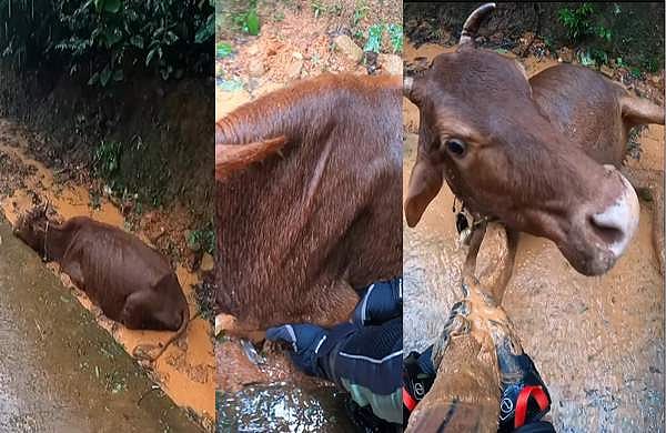 കർണാടക ഉടുപ്പിയിലെ അമാസെബൈലു എന്ന പ്രദേശത്ത് കനത്ത മഴയെ തുടർന്ന് റോഡരിൽ ചെളിയിൽ നാലുകാലുകളും അകപ്പെട്ട് പകുതിയോളം മുങ്ങിയ അവസ്ഥയിലായിരുന്നു പശു ഉണ്ടായിരുന്നത്. അതു വഴിപോയ രണ്ട് ബൈക്ക് റൈഡേഴ്സാണ് പശുവിനെ പുറത്തെടുത്തത്. അന്നി അരുൺ എന്ന ഇൻസ്റ്റഗ്രാം പേജിൽ പങ്കുവെച്ച വിഡിയോ വളരെ ചുരുങ്ങിയ സമയം കൊണ്ട് തന്നെ വൈറലായി. ഏതാണ്ട് പത്ത് മില്യൺ ആളുകളാണ് വിഡിയോ ഇതുവരെ കണ്ടത്.