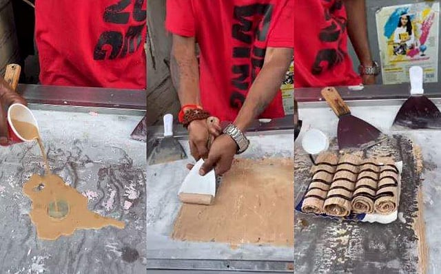 ചായയുടെ രുചിയുള്ള ഐസ്ക്രീം റോളാണ് ഇപ്പോള് വൈറലായിരിക്കുന്നത്. ഐസ് പാനിലേക്ക് ചൂട് ചായ ഒഴിച്ച് പാലും ചോക്ലേറ്റ് സിറപ്പും ചേര്ത്താണ് പുതിയ വിഭവം തയ്യാറാക്കിയിരിക്കുന്നത്. സാധാരണ ഐസ്ക്രീം റോള് തയ്യാറാക്കുന്നതുപോലെതന്നെ ഇത് പരത്തി മുറിച്ച് ഓരോ റോളുകളാക്കി പ്ലേറ്റില് നിരത്തും. കുറച്ചുകൂടി ചോക്ലേറ്റ് സിറപ്പ് മുകളില് ഒഴിച്ചാല് സംഗതി റെഡി.