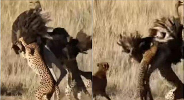 മുന്നിൽ നിന്നും പിന്നിൽ നിന്നും ഒരേ സമയം ഒട്ടകപ്പക്ഷിയുടെ ശരീരത്തിൽ പിടുത്തമിട്ട ചീറ്റകൾ ഏറെ നേരത്തെ പരിശ്രമത്തിനു ശേഷമാണ് ഒട്ടകപ്പക്ഷിയെ കീഴ്പ്പെടുത്തിയത്. ചീറ്റകളുടെ പിടിയിൽ നിന്ന് കുതറി രക്ഷപ്പെടാൻ ശ്രമം നടത്തിയെങ്കിലും വിജയിച്ചില്ല.