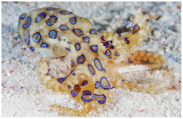 സയനൈഡിനെക്കാള് 1200 മടങ്ങ് ശക്തമാണ് ബ്ലൂ റിങ്ഡ് ഒക്ടോപസിന്റെ വിഷം. ഇത് ശരീരത്തെ മിനിറ്റുകള്ക്കുള്ളില് മരവിപ്പിക്കുന്നു. ശരീരത്തിന് ആവശ്യമായ ഓക്സിജന് വലിച്ചെടുക്കാനുള്ള ശേഷിയെ തടഞ്ഞ് നിമിഷങ്ങള്ക്കുള്ളില് മരണം സംഭവിക്കും. ന്യൂറോടോക്സിന് ടെട്രഡോടോക്സിന് എന്ന ഘടകമാണ് വിഷത്തില് അടങ്ങിയിട്ടുള്ളത്.