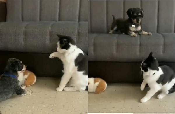 കൗതുകം കൊണ്ട് ചിരിപ്പിക്കുന്ന നിരവധി വിഡിയോകൾ സോഷ്യൽമീഡിയയിൽ പലപ്പോഴും വൈറലാകാറുണ്ട്. അത്തരത്തിൽ ഒന്നാണ് ഇപ്പോൾ സോഷ്യൽമീഡിയയിൽ നിറഞ്ഞു നിൽക്കുന്നത്. ഉറങ്ങിക്കിടക്കുന്ന സുഹൃത്തിനെ തൊടാൻ വരുന്ന പൂച്ചയെ പേടിപ്പിക്കുന്ന നായക്കുട്ടി, ഇവർക്കിടയിലെ ചെറിയ ഫൈറ്റ് സീൻ ആണ് വിഡിയോയിൽ.