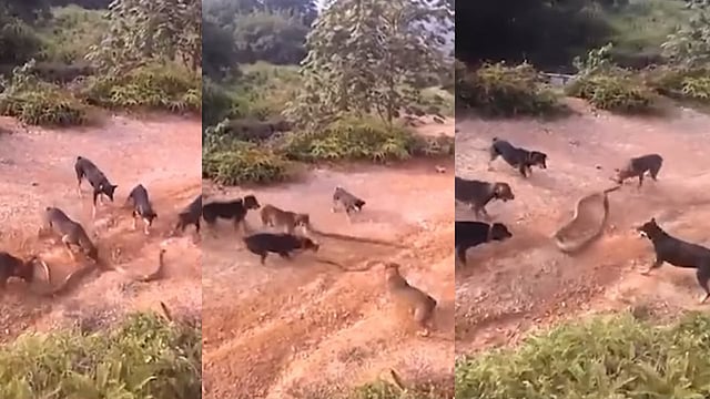 പിന്നില് നിന്നും മുന്നില് നിന്നും സൈഡില് നിന്നുമൊക്കെ നായകള് കൂട്ടത്തോടെ കീഴ്പ്പെടുത്താന് ശ്രമിക്കുന്നുണ്ടെങ്കിലും ആക്രമണത്തില് നിന്നെല്ലാം പാമ്പ് കുതറി മാറുന്നത് വിഡിയോയില് കാണാം. നായകളുടെയും പാമ്പിന്റെയും സംഘം ചേര്ന്ന് ചേരി തിരിഞ്ഞാണ് സോഷ്യല്മീഡിയയിലും പോര്. നായകളുടെ പോരാട്ട വീര്യത്തെ അഭിനന്ദിച്ച് കൂട്ടമായി ചെയ്താല് എന്തും ചെയ്യാമെന്നായിരുന്നു ഒരാളുടെ കമന്റ്. എന്നാല് പാമ്പിനോട് തിരിച്ചു ആക്രമിക്കാന് പറഞ്ഞവരും കമന്റു ചെയ്തവരുടെ കൂട്ടത്തിലുണ്ട്.