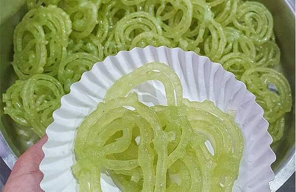 മധുരപലഹാരങ്ങളുടെ നിരയില് ജിലേബിക്ക് ഒരു പ്രത്യേക സ്ഥാനം തന്നെയുണ്ട്. പഞ്ചസാര പാനിയില് കുതിര്ന്ന് കിടക്കുന്ന ജിലേബി മുതല് നല്ല ചൂടന് ജിലേബി വരെ പല വെറൈറ്റികള് ഉണ്ട്. പക്ഷെ, 'മൗണ്ടന് ഡ്യൂ ജിലേബി' എന്ന് കേട്ടിട്ടുണ്ടോ? സംഗതി പരീക്ഷണമൊന്നുമല്ല, ബംഗളൂരുകാരുടെ സ്വന്തം അവരെബെലെ ജിലേബി ആണ് ഇത്. ഫ്ളൂറസെന്റ് പച്ച നിറത്തിലുള്ള ജിലേബി ആയതിനാലാണ് ഇതിനെ 'മൗണ്ടന് ഡ്യൂ' ജിലേബിയെന്ന് വിളിക്കുന്നത്.