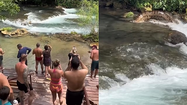 വെള്ളത്തില് ഇറങ്ങാന് സ്വിമ്മിങ് വേഷം ധരിച്ച് സഞ്ചാരികള് പുഴത്തീരത്ത് നില്ക്കുമ്പോഴാണ് അനാക്കോണ്ടയെ കണ്ടത്. ഇതോടെ പുഴയില് ഇറങ്ങേണ്ട എന്ന് സഞ്ചാരികള് തീരുമാനിച്ചു. പുഴയില് ഇറങ്ങിയിരുന്നെങ്കില് എന്തുസംഭവിക്കുമായിരുന്നു എന്ന് ചിന്തിച്ച് സഞ്ചാരികള് ആശങ്കയും പങ്കുവെച്ചു. ടൂറിസ്റ്റ് കേന്ദ്രം ഏതെന്ന് വ്യക്തമല്ല.