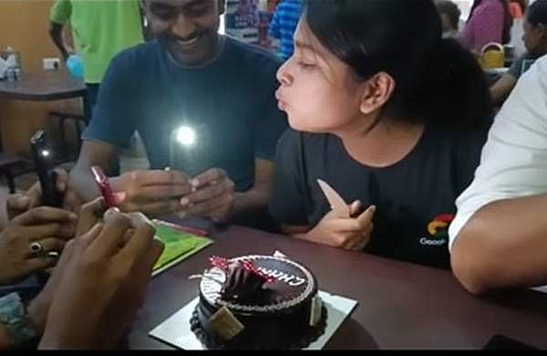 എന്നാൽ ഇവിടെ മെഴുകുതിരിക്ക് പകരം സുഹൃത്തുക്കൾ ഒരുക്കിയത് ഒരു ക്യൂട്ട് സർപ്രൈസായിരുന്നു. ഫോണിലെ ഫ്ലാഷ് ലൈറ്റുകൾ ഓൺ ചെയ്തു പിറന്നാളുകാരിക്ക് ചുറ്റും പിടിച്ചു. ഓരോ ഫ്ലാഷ് ലൈറ്റിലേക്കും പിറന്നാളുകാരി ഊതുന്ന സമയത്ത് സുഹൃത്തുക്കൾ ഓരോരുത്തരും ലൈറ്റ് ഓഫാക്കും. ടൈമിങ് കൂടാതെ കൃത്യമായപ്പോൾ സംഭവം പൊളിയായി.