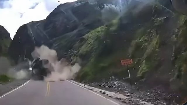 പെറുവില് നിന്നുള്ളതാണ് ദൃശ്യങ്ങള്. മലയോര ഹൈവേയിലൂടെ യാത്ര ചെയ്യുമ്പോഴാണ് ലോറി അപകടത്തില്പ്പെടുന്നത്. മലയുടെ മുകളില് നിന്ന് ഉരുണ്ടുവരുന്ന വലിയ പാറക്കഷണം ലോറിയുടെ മുകളിലേക്ക് വീഴുന്നതാണ് ദൃശ്യങ്ങളിലുള്ളത്. വീഴ്ചയുടെ ആഘാതത്തില് ലോറി മറയുന്നതും ദൃശ്യങ്ങളില് കാണാം.