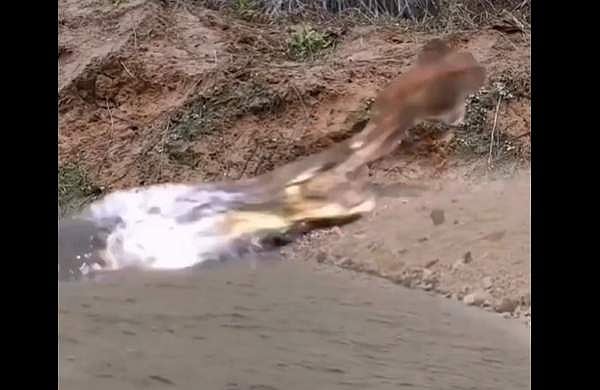 മുതലയുടെ ചലനം മനസിലാക്കി ഞൊടിയിടയില് മാന് പിന്നിലേക്ക് കുതിച്ചാണ് രക്ഷപ്പെട്ടത്. സോഷ്യല്മീഡിയയില് അടക്കം വ്യാപകമായാണ് വീഡിയോ പ്രചരിക്കുന്നത്.