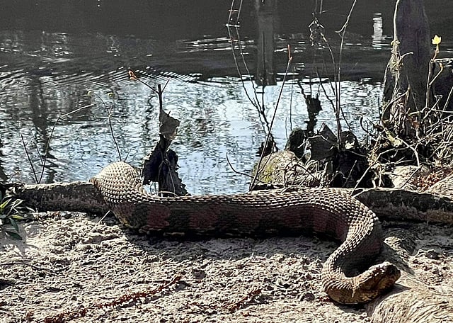 സൗത്ത് കരോലിന: തടകാക്കരയിൽ വിശ്രമിക്കുന്ന കൂറ്റൻ പാമ്പിന്റെ ചിത്രങ്ങൾ വൈറൽ. സൗത്ത് കരോലിനയിലെ ഫ്ലോറൻസിലുള്ള ജെഫ്രീസ് ക്രീക്ക് പാർക്കിൽ ഹെക്കിങ്ങിനെത്തിയ മെറിഡിത് ലാങ്ലെ എന്ന സ്ത്രീയാണ് തടാകക്കരയിൽ വിശ്രമിക്കുന്ന നിലയിൽ വമ്പൻ പാമ്പിനെ കണ്ടത്. ഇവർ തന്നെയാണ് പാമ്പിന്റെ ചിത്രങ്ങൾ ക്യാമറയിൽ പകർത്തിയതും സാമൂഹിക മാധ്യമങ്ങളിലൂടെ പങ്കുവച്ചതും.