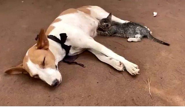 പൂച്ചക്കൂട്ടി പാലുകുടിക്കുമ്പോള് വളരെ ശാന്തമായി കിടക്കുകയാണ് പട്ടി. ഇത് അസാധാരണമായ കാഴ്ചയാണെന്നാണ് വീഡിയോ ഷെയര് ചെയ്ത് പലരും പറയുന്നത്.