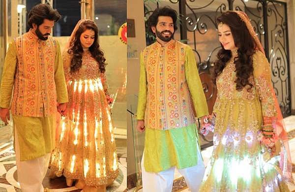 മഞ്ഞയിൽ പിങ്ക് നിറത്തിൽ അതിമനോഹരമായി എംബ്രോയ്ഡറി ചെയ്ത ലഹങ്കൽ പല ഭാഗങ്ങളിലായി എൽഇഡി പിടിപ്പിച്ചിരിക്കുന്നു. ബീറ്റിന് അനുസരിച്ച് ഡാൻസ് ചെയ്യുന്നപോലെ ലൈറ്റുകളും മിന്നി മാറുന്നുണ്ട്. പാകിസ്ഥാൻ ദമ്പതികളുടെ കല്യാണത്തിന് എത്തിയവരുടെ കണ്ണുകളും ലഹങ്ക ഒന്നു മിന്നിയിട്ടുണ്ടാവും.