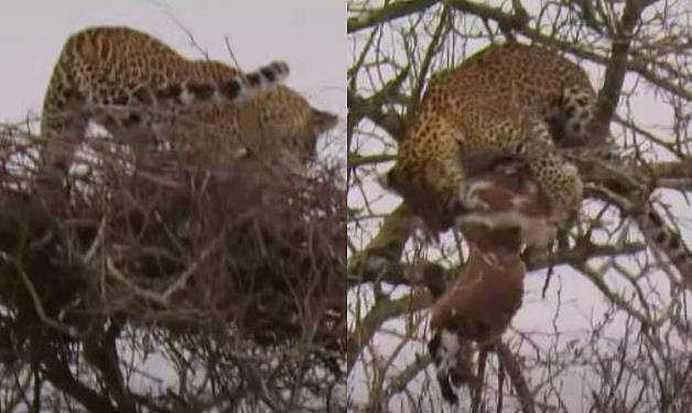 ബൈനോക്കുലറിലൂടെ നോക്കിയപ്പോൾ കണ്ടത് മരത്തിനു മുകളിലുള്ള കൂട്ടിൽ നിൽക്കുന്ന പുള്ളിപ്പുലിയെയാണ്. പരുന്തിന്റെ കുഞ്ഞിനെ കടിച്ചെടുത്ത പുള്ളിപ്പുലി ഏറെ പണിപ്പെട്ടാണ് ചില്ലകൾക്കിടയിലൂടെ താഴേക്കിറങ്ങിയത്. താഴെച്ചാടിയ പുള്ളിപ്പുലി വായിൽ കടിച്ചുപിടിച്ച പരുന്തിന്റെ കുഞ്ഞുമായി പുല്ലുകൾക്കിടയിൽ മറയുന്നതും ദൃശ്യങ്ങളിലുണ്ട്.