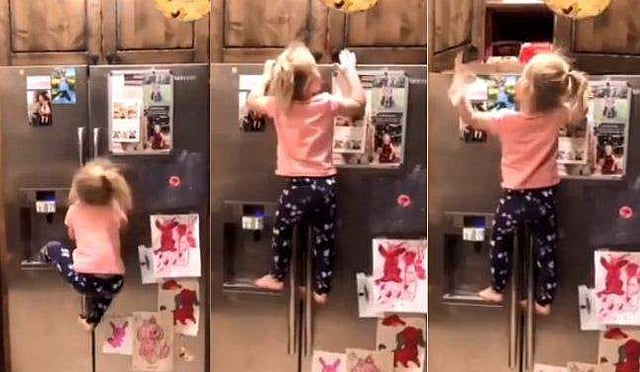 കുട്ടികളുടെ കണ്ണുവെട്ടിച്ച് മധുരപലഹാരങ്ങൾ മാറ്റിവയ്ക്കാൻ പഠിച്ച പണി പതിനെട്ടും പയറ്റുന്നവരാണ് രക്ഷിതാക്കൾ. കൈയെത്താത്ത ഉയരത്തിൽ വച്ചാണ് പലപ്പോഴും ഇക്കാര്യത്തിൽ പരിഹാരം കാണുന്നത്. എന്നാലിപ്പോൾ ഉയരമൊന്നും ഒരു പ്രശ്നമല്ലെന്ന് കാണിച്ച് ഫ്രിഡ്ജിന് മുകളിൽ സൂക്ഷിച്ചിരുന്ന ബിസ്ക്കറ്റ് കവർ കൈക്കലാക്കിയ കുട്ടിക്കുറുമ്പിയുടെ വിഡിയോയാണ് വൈറലാകുന്നത്.