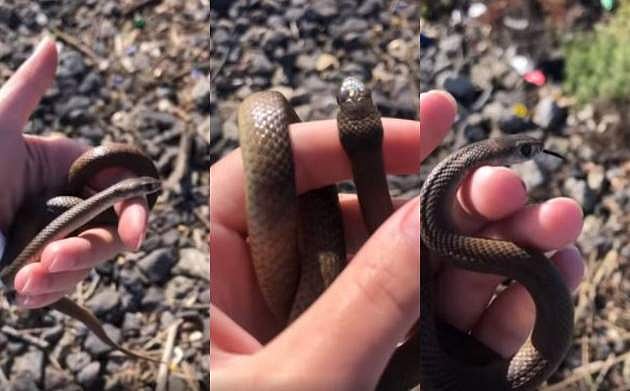 പാമ്പുകളെ പിടിക്കുന്ന സ്റ്റെവി ദി സ്നേക് ക്യാച്ചർ എന്ന സ്ഥാപനമാണ് വീഡിയോ പുറത്തുവിട്ടത്. തുറസായ പ്രദേശത്ത് നടക്കുന്നതിനിടെ മുന്നിൽ കണ്ട ചെറിയ പാമ്പിനെ പെൺകുട്ടി കൈയിലെടുക്കുകയായിരുന്നു. കൈപ്പത്തിയിൽ കൊള്ളാവുന്ന വലിപ്പമുള്ള പാമ്പ് പെൺകുട്ടിയുടെ വിരലിലൂടെ ഇഴഞ്ഞ് നീങ്ങുന്നതും വീഡിയോയിൽ കാണാം.