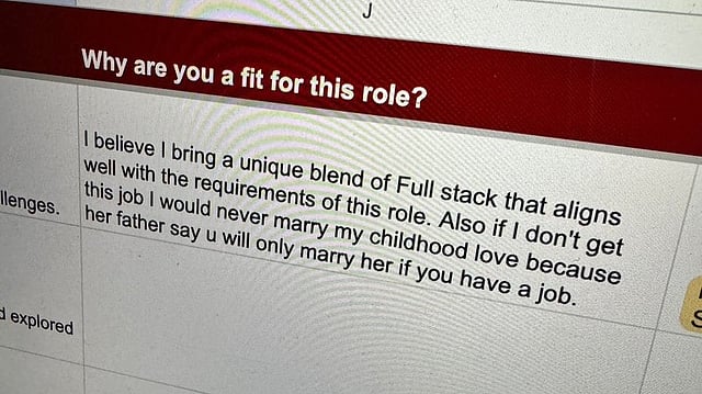 എന്തുകൊണ്ട് നിങ്ങളെ ഈ ജോലിക്കായി തെരഞ്ഞെടുക്കണം എന്നാണ് ചോദ്യം- 'ഈ ജോലിക്ക് വേണ്ട എല്ലാ ആവശ്യകതയും എന്നിലുണ്ട് കൂടാതെ ഈ ജോലി കിട്ടിയില്ലെങ്കില് എനിക്കെന്റെ കുട്ടിക്കാലം മുതലുള്ള പ്രണയത്തെ നഷ്ടമാകും. കാമുകിയെ വിവാഹം കഴിക്കണമെങ്കില് ജോലി വേണമെന്ന് അവളുടെ അച്ഛന് നിര്ബന്ധം പറഞ്ഞുവെന്നും അപേക്ഷയില് യുവാവ് കുറിച്ചു. വളരെ ചുരുങ്ങിയ സമയം കൊണ്ട് യുവാവിന്റെ അപേക്ഷ സോഷ്യല്മീഡിയ ഏറ്റെടുത്തു. 'നിങ്ങള് തീര്ച്ചയായും അയാളുടെ സത്യസന്ധത കാണാതെ പോകരുത്' എന്നായിരുന്നു ഒരാളുടെ കമന്റ്. 'പ്രണയിക്കുന്നവന്റെ മനസ്സ് കാണാതെ പോകരുത്'- എന്നായിരുന്നു മറ്റൊരുടെ കമന്റ്.