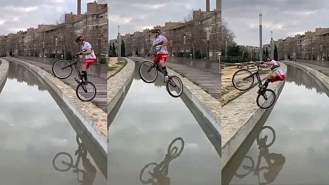 എന്നാൽ പിന്നീട് സൈക്കിളിന്റെ മുൻവശം ഉയർത്തി ഒറ്റ ചക്രത്തിൽ സൈക്കിൾ യുവാവ് ബാലൻസ് ചെയ്യുന്നത് വിഡിയോയിൽ കാണാം. തുടർന്ന് സൈക്കിളുമായി യുവാവ് കനാലിന് കുറുകെ ചാടുകയായിരുന്നു. കണക്കുകൂട്ടൽ എവിടെയെങ്കിലും പിഴച്ചിരുന്നെങ്കിൽ യുവാവ് സൈക്കിളുമായി വെള്ളത്തിൽ കിടക്കുമായിരുന്നു. ശ്വാസം അടക്കിപ്പിടിക്കുന്ന തരത്തിലുള്ളതാണ് പ്രകടനം.