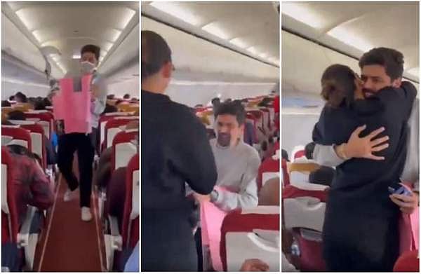 എയര്ഇന്ത്യ വിമാനമാണ് വേദി. വിമാനം പറന്നുയുർന്നതിന് പിന്നാലെ സീറ്റിൽ നിന്നും എഴുന്നേറ്റ് കാമുകിക്കൊപ്പമുള്ള മനോഹര ചിത്രങ്ങൾ കൊലാഷ് ചെയ്ത പോസ്റ്റർ പിടിച്ചുകൊണ്ട് പെൺകുട്ടി ഇരിക്കുന്ന സീറ്റിനടുത്തെത്തി അടുത്തെത്തി. മാസ്ക് മാറ്റി ആളെ കണ്ടപ്പോഴാണ് കാര്യം എന്താണ് പെൺകുട്ടി പോലും മനസിലാക്കുന്നത്. അമ്പരന്ന് ഇറങ്ങിവന്ന പെൺകുട്ടി മുന്നിൽ മുട്ടിലിരുന്ന് റിങ് നീട്ടി പ്രപ്പോസ് ചെയ്തു.