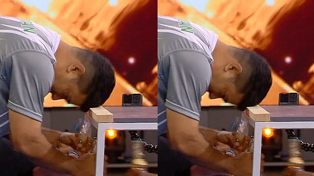 സഹായികള് കൈമാറുന്ന കുപ്പി കൈ കൊണ്ട് പിടിച്ച് തല കൊണ്ട് അടപ്പ് തുറക്കുന്നതാണ് ദൃശ്യങ്ങളിലുള്ളത്. കുപ്പിയുടെ അടപ്പ് തുറക്കുന്ന വേഗമാണ് എല്ലാവരെയും അത്ഭുതപ്പെടുത്തുന്നത്.