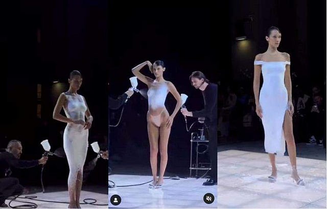 അടിവസ്ത്രം മാത്രം ധരിച്ചു വേദിയിലെത്തിയ ബെല്ലയ്ക്ക് പിന്നാലെ റാംപിലെത്തിയ രണ്ടു പേര് വെള്ള നിറത്തിലുള്ള ദ്രാവകം മോഡലിന്റെ ദേഹത്തേക്ക് സ്പ്രേ ചെയ്യാന് തുടങ്ങി. ഏറെ വൈകാതെ ഇത് ഉണങ്ങുകയും വസ്ത്രം പോലെ തോന്നിക്കുകയും ചെയ്തു. തുടര്ന്ന് ഡിസൈനര് എത്തി സ്ലിറ്റും സ്ലീവും നല്കി ഒരു സ്റ്റൈലിഷ് ഗൗണാക്കി ഇതിനെ മാറ്റുകയായിരുന്നു.