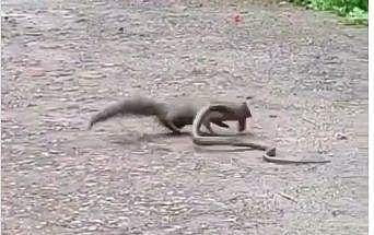 റോഡിലൂടെ ഇഴഞ്ഞു നീങ്ങിയ മൂര്ഖന്റെ പിന്നാലെയെത്തിയ കീരി അതിനെ ആക്രമിക്കുകയായിരുന്നു. രണ്ട് കീരികളാണ് സംഭവസ്ഥലത്ത് ഉണ്ടായിരുന്നത്. എന്നാല് അതില് ഒരു കീരി മാത്രമാണ് പാമ്പിനെ ആക്രമിച്ചത്. പത്തിവിരിച്ചു നിന്ന മൂര്ഖന് പാമ്പിന്റെ തൊട്ടു മുന്നിലെത്തിയ കീരി അതിന്റെ തലയില് ചാടിക്കടിക്കുന്നത് ദൃശ്യത്തില് കാണാം.