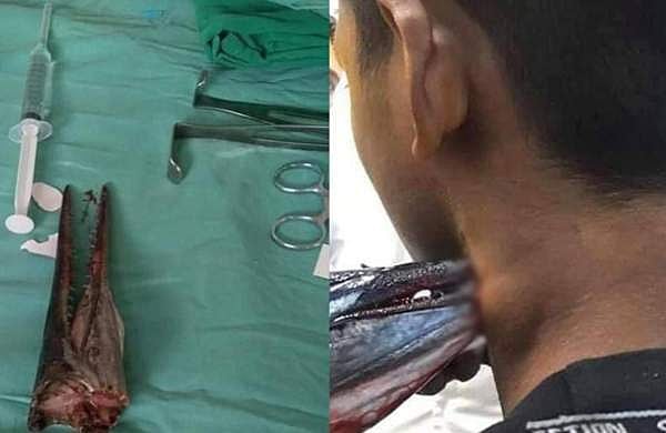 മീന് പിടിക്കുന്നതിനിടെ മീന് പറന്ന് വന്ന് യുവാവിനെ ആക്രമിക്കുകയായിരുന്നു. മീനിന്റെ വായഭാഗം യുവാവിന്റെ കഴുത്തില് തറച്ചിരിക്കുന്ന നിലയിലുള്ള ചിത്രം സോഷ്യല്മീഡിയയിലും വ്യാപകമായി പ്രചരിക്കുന്നുണ്ട്. ഒരു മണിക്കൂര് നീണ്ട ശസ്ത്രക്രിയയ്ക്ക് ശേഷമാണ് ഇദുലിന്റെ കഴുത്തില് നിന്നും മീനിനെ നീക്കിയത്.