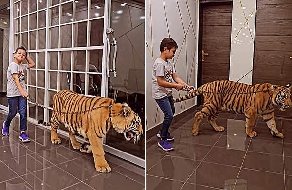 പാകിസ്ഥാനിയായ നൂമാൻ ഹസ്സൻ എന്ന വിഡിയോ ക്രിയേറ്ററുടെ ഇൻസ്റ്റഗ്രാം പേജിൽ പ്രത്യക്ഷപ്പെട്ട വിഡിയോയ്ക്ക് സംമിശ്ര പ്രതികരണമാണ് ആളുകൾ നൽകുന്നത്. കടുവയുടെ കഴുത്തിൽ ചങ്ങലകൊണ്ട് ബന്ധിച്ചിട്ടുണ്ട്. കുട്ടി വളരെ നിസാരമായി കടുവയെ നിയന്ത്രക്കുന്നതും വിഡിയോയിൽ കാണാം.