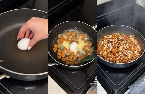 കാരമൽ പോപ്കോൺ എന്ന് കേൾക്കുമ്പോൾ വിചിത്രമായി ഒന്നും തോന്നാനില്ല എന്നാൽ ഇത് തയ്യാറാക്കുമ്പോൾ പാത്രത്തിലേക്ക് ഒരു പുഴുങ്ങിയ മുട്ട ഇട്ടതാണ് സംഗതി ചർച്ചയാക്കിയത്. പാൻ ചൂടാക്കി അതിലേക്ക് നേരെ ഒരു പുഴുങ്ങിയ മുട്ട വയ്ക്കുകയായിരുന്നു ഇതിലേക്ക് ബട്ടറും പിന്നാലെ കാരമൽ മിഠായിയും ചേർന്നു. നന്നായി അലുത്തതിന് ശേഷം പോപ്കോണും ഇട്ടു. മൂടിവച്ച് പോപ്കോൺ തയ്യാറാക്കികഴിഞ്ഞപ്പോൾ പാനിൽ വച്ച മുട്ട എടുത്തുമാറ്റുന്നതും കാണാം. എന്തിനാണ് ഈ മുട്ട വച്ചത് എന്നതാണ് വിഡിയോ കണ്ടവരെ ആശയക്കുഴപ്പത്തിലാക്കിയത്.