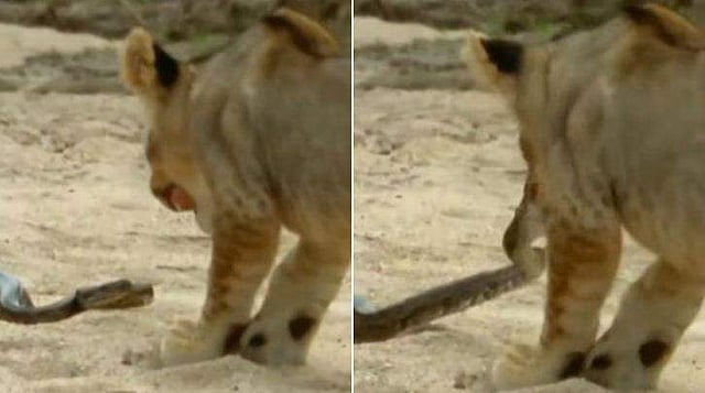 മണൽപ്പരപ്പിൽ കിടന്ന പെരുമ്പാമ്പിനെ കണ്ട കൗതുകത്തിന് അതിന്റെ സമീപമെത്തിയതായിരുന്നു സിംഹക്കുട്ടി