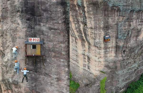 പലതരത്തിലുള്ള നിര്മിതികള് കൊണ്ട് ചൈന ലോകത്തെ അമ്പരപ്പിച്ചിട്ടുണ്ട്. അത്തരത്തൊരു നിര്മിതിയാണ് ഹുനാന് പ്രവിശ്യയിലെ മലയിടുക്കില് 2018ല് നിര്മിച്ച 'ഹാങ്ങിങ് സ്റ്റോര്'. 120 മീറ്റര് ഉയരത്തിൽ മലയിടുക്കിന്റെ ഒരു വശത്തായി സ്ഥിതി ചെയ്യുന്ന ഈ സ്റ്റോർ കാഴ്ചക്കാരെ അമ്പരപ്പിക്കുന്നതാണ്. ഷിനിയുഴൈ നാഷണൽ ജിയോളജിക്കൽ പാർക്കിലാണ് ഇത് നിർമിച്ചിരിക്കുന്നത്. ഇവിടെ മല കയറിയുന്ന സാഹസികര്ക്ക് വേണ്ട സ്നാക്സും വെള്ളവുമാണ് ഈ കടയിൽ വിൽക്കുന്നത്.