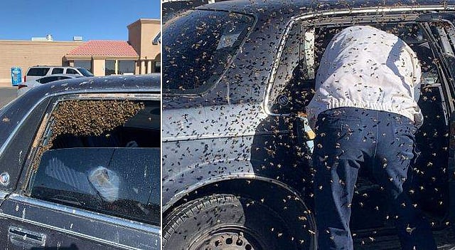 കാർ പാർക്ക് ചെയ്ത് കടയിൽ സാധനം വാങ്ങാൻ പോയ ഉടമസ്ഥൻ തിരിച്ചെത്തിയപ്പോൾ കാറിൽ നിറയെ തേനീച്ചകൾ! അമേരിക്കയിലെ ന്യൂ മെക്സിക്കോയിലാണ് സംഭവം. പാർക്കിങ് ഏരിയയിൽ നിർത്തിയിട്ട കാർ കൈയടക്കിയത് 15,000ത്തിൽ അധികം തേനീച്ചകൾ. കടയ്ക്കു മുന്നിലായി നിർത്തിയിട്ട കാറിൽ നിമിഷങ്ങൾക്കുള്ളിലാണ് തേനീച്ചകൾ കടന്നു കൂടിയത്. പിന്നിലെ വിൻഡോ തുറന്നിട്ട നിലയിലായതിനാൽ അതിലൂടെയാണ് തേനീച്ചകൾ ഉള്ളിൽ കയറയത്.