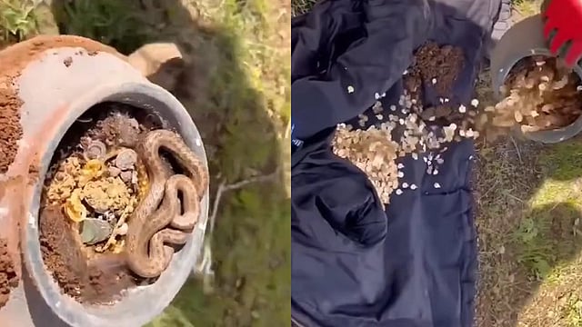 നിധി കുംഭം അന്വേഷിച്ചുള്ള യാത്ര... ഒടുവില് സ്വര്ണ ശേഖരം കണ്ടെത്തുന്നു... എന്നാല് നിധി കുംഭത്തിന് കാവലായി പാമ്പ്... ഇത് ചിലരെങ്കിലും സ്വപ്നത്തില് കണ്ടുകാണാം. ഇപ്പോള് സമാനമായ സംഭവത്തിന്റെ വീഡിയോയാണ് സാമൂഹികമാധ്യമങ്ങളില് വൈറലാകുന്നത്.