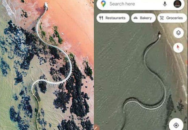 കഴിയുന്നത്ര യാത്രചെയ്ത് ഇഷ്ടസ്ഥലങ്ങളൊക്കെ ഒരിക്കലെങ്കിലും കാണണം എന്നാഗ്രഹിക്കുന്നവര് ഏറെയാണ്. ഇത് പറ്റാത്തവര് ഗൂഗിള് മാപ്പിലെങ്കിലും ഈ സ്ഥലങ്ങളൊക്കെ കണ്ടുകളയാം എന്ന് ചിന്തിക്കുന്നതും ഇപ്പോള് സാധാരണമാണ്. പക്ഷെ ഇതിനിടയില് എപ്പോഴെങ്കിലും വിചിത്രമായ കാഴ്ചകള് നിങ്ങളുടെ കണ്ണിലുടക്കിയിട്ടുണ്ടോ? എന്നാലിതാ ഒരു ഭീമന് പാമ്പിന്റെ അസ്ഥികൂടം കണ്ടെന്നാണ് ഗൂഗിള് മാപ്പിലെ കാഴ്ചകള് തേടിയിരങ്ങിയ ഒരു ടിക്ക്ടോക്കര് പറയുന്നത്.