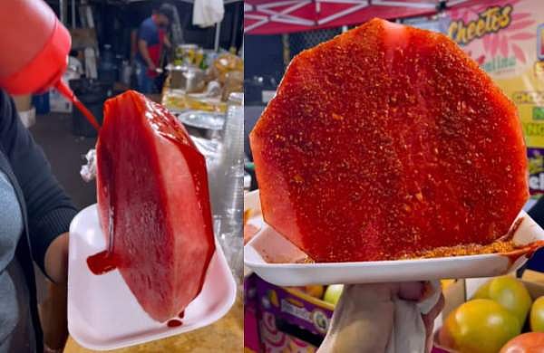 ഒരു തണ്ണിമത്തന്റെ പകുതി ഭാഗമെടുത്ത് കോലില് കുത്തിയശേഷം ഇതൊരു പ്ലേറ്റിലേക്ക് യോജിപ്പിക്കും. പിന്നെ, തണ്ണിമത്തനിലേക്ക് നിറയെ സോസ് ഒഴിക്കുന്നത് കാണാം. പലരും ഇത് കെച്ചപ്പ് ആണെന്ന് തെറ്റിദ്ധരിച്ചെങ്കിലും സംഗതി ചമോയ് എന്ന സോസ് ആണ്. ഇതിന് പുറമെ കുറച്ച് സ്പൈസസും നാരങ്ങാനീരും പിഴിഞ്ഞൊഴിക്കുന്നത് കാണാം.
