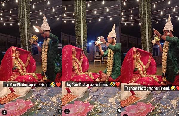 സ്വന്തം വിവാഹത്തിന് വധുവിന്റെ ഫോട്ടോസ് പകർത്തുന്ന വരന്റെ ദൃശ്യങ്ങളാണ് ഇപ്പോൾ സമൂഹമാധ്യമങ്ങളിൽ വൈറലാകുന്നത്. വെഡ്ഡിങ്ങ് ഫോട്ടോഗ്രാഫറായ അയാൻ സെന്നാണ് വധുവായ പ്രിയയുടെ ഫോട്ടോ പകർത്തിയത്.