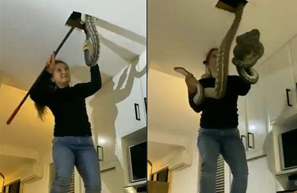 ഓസ്ട്രേലിയയിലാണ് സംഭവം. യുവതി വീടിന്റെ റൂഫിലെ ഒരു വിടവില് നീണ്ട കോലുകൊണ്ട് കുത്തുന്നതിനിടെ ഒരു പാമ്പിന്റെ മധ്യഭാഗം പുറത്തു വരുന്നത് വിഡിയോയിൽ കാണാം. തുടര്ന്ന് യുവതി പിടിച്ചു വലിക്കുമ്പോള് തലഭാഗം പുറത്തേക്ക് നീളുന്നു. ഉടനെ പാമ്പിന്റെ തലയില് പിടിച്ച് പുറത്തെടുത്തു.