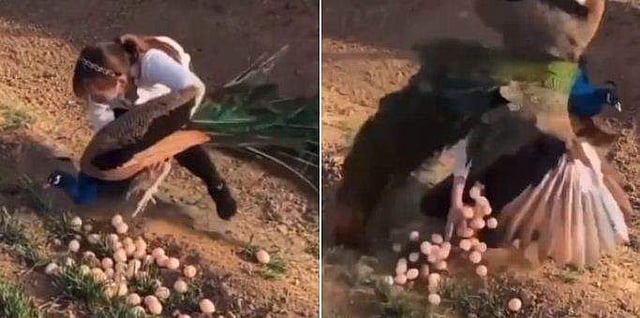 മയിലിനെ എടുത്തെറിഞ്ഞ് മുട്ടകൾ വാരിയെടുത്ത് യുവതി; പിന്നാലെ സംഭവിച്ചത്! (വീഡിയോ)